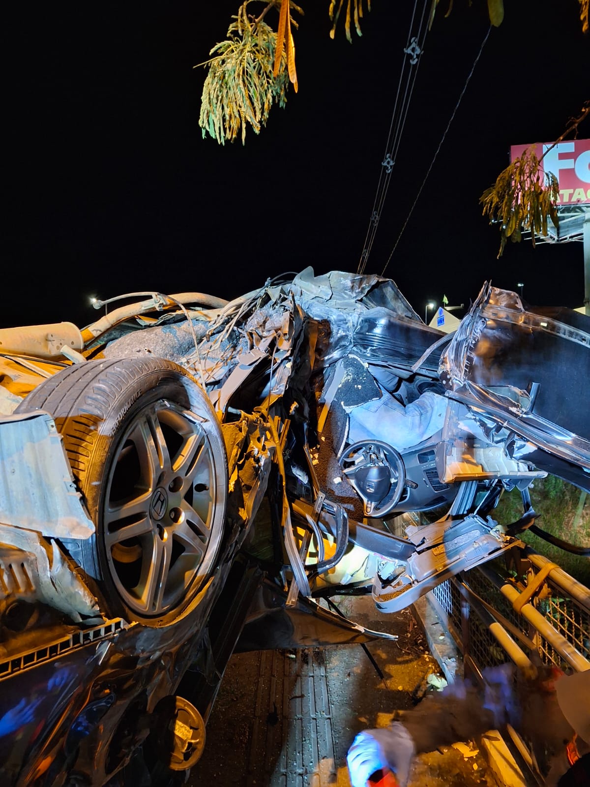 O acidente aconteceu por volta das 4h30 da manhã, quando o carro capotou e parou de forma impressionante: com as rodas para cima, parte apoiada sobre uma mureta e o capô suspenso em uma grade, sem tocar o chão. Os bombeiros rapidamente chegaram ao local, isolaram a área e iniciaram os procedimentos de resgate.
