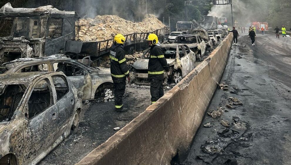 O acidente ocorreu na tarde de ontem, quando uma carreta transportando etanol tombou no sentido sul da rodovia, na região do Morro dos Cavalos. Parte da carga pegou fogo e o incêndio se alastrou, atingindo outros 24 veículos. O condutor da carreta e a passageira sofreram queimaduras graves, assim como três ocupantes de outros veículos, todos socorridos por equipes de emergência.