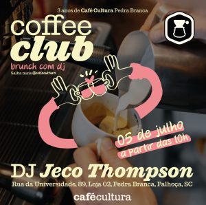 Comemoração – O Café Cultura da Pedra Branca, em Palhoça, está em clima de comemoração. A franquia comandada pelos empresários e investidores Laura e Hugo Werneck de Castro completa três anos de operação com um evento super especial: o Coffee Club, que chega à sua quarta edição no próximo sábado (5), das 10h às 14h. A proposta une brunch, cafés especiais, drinks e balada diurna, embalada pelo set exclusivo do DJ Jeco Thompson.
